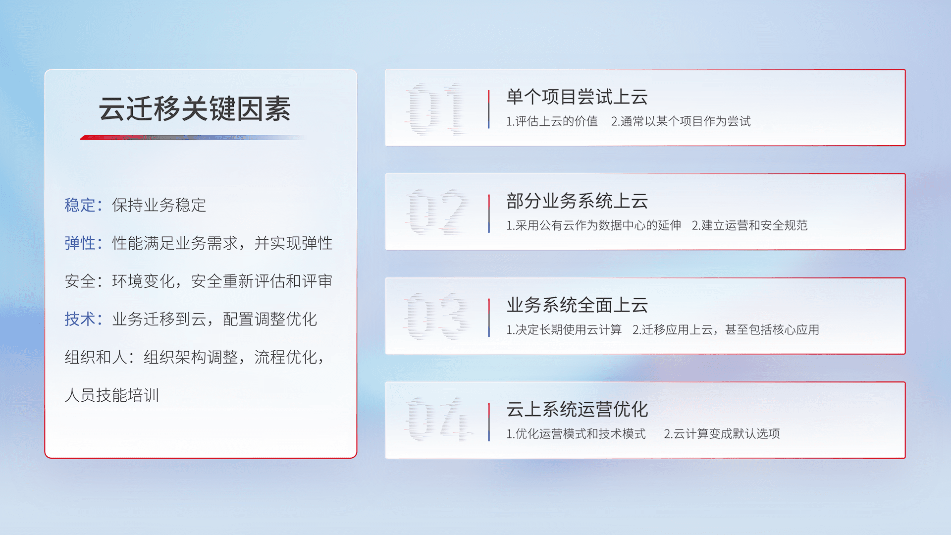 结合实际业务,,,,从规划设计、、云平台选型、、云原生改造、、数据迁移、、、、集成交付,,迁移全过程为客户识别最佳上云路径,,,,做好风险识别管理,,,,设计网络架构、、、身份权限、、安全审计合规、、、操作审计、、、日志审计、、、、监控告警策略、、多站点容灾设计等,,,对云上基础设施进行整体规划,,提升IT治理水平,,,,以满足弹性、、、高可用、、、高性能的需求。。。
