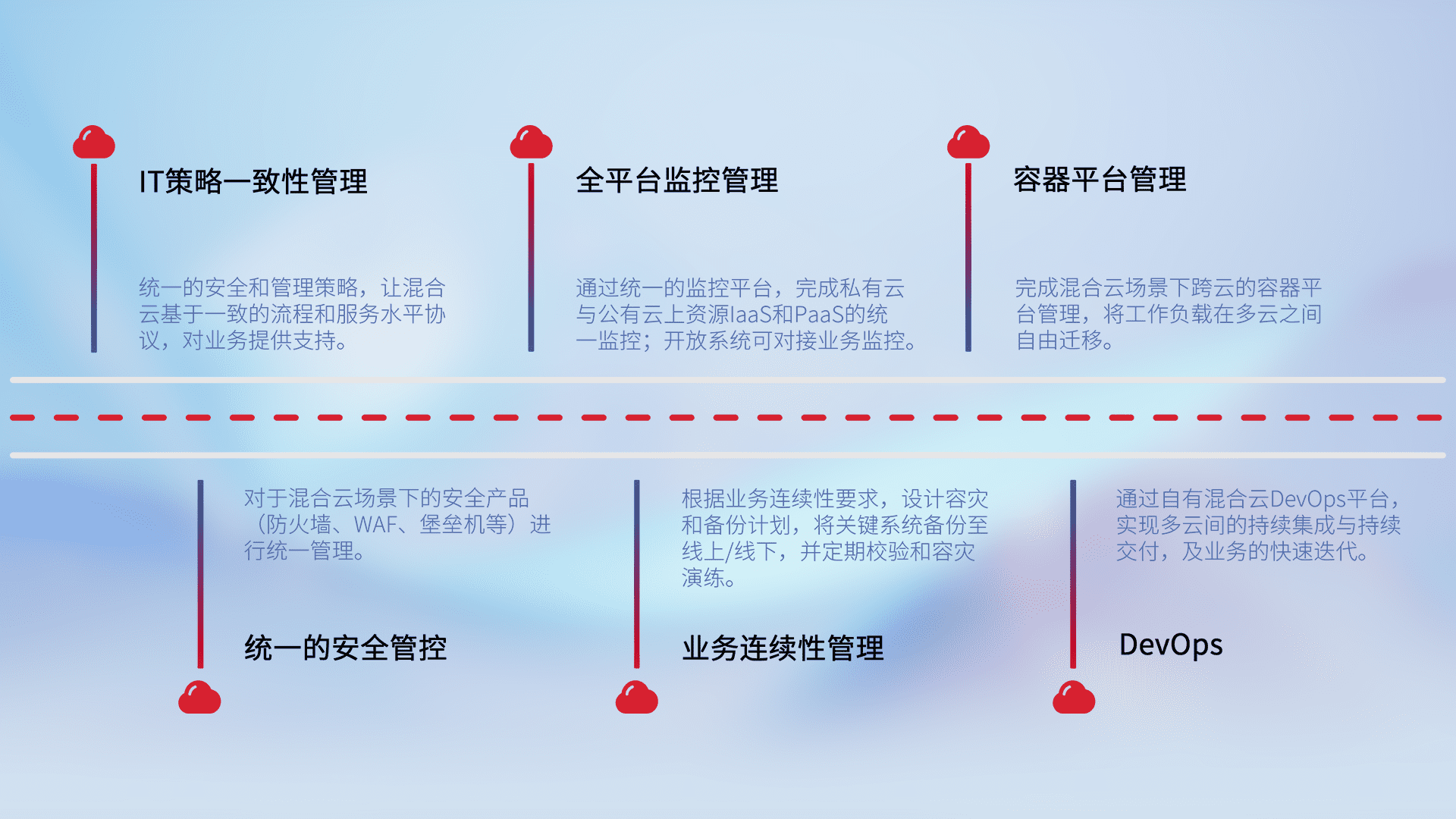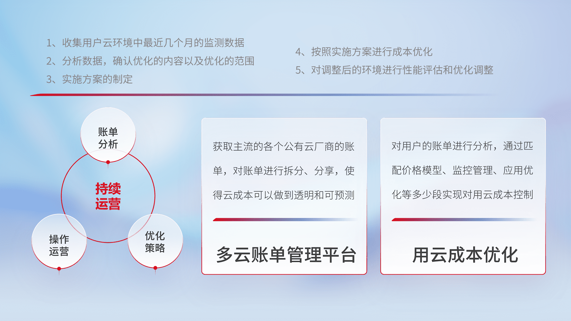通过多云纳管,,,,以统一的资源数据模型把客户的云资源进行抽象和封装,,,进而实现对多云资源的统一操作,,保障云资源管理的可靠性、、稳定性与可用性。。量身定制化运维内容,,配置、、开发运维、、补丁管理、、、备份、、、监控、、、、认证和访问管理、、、、审计和日常巡检等,,,保障在用云过程中的可靠度,,稳定度以及高可用率。。。。