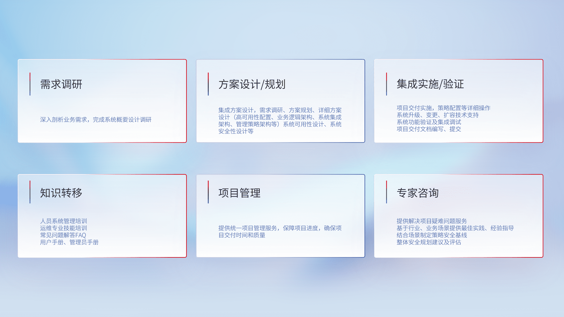 针对客户行业特性,,将宏观的安全战略和需求,,通过专业的交付服务,,,,实现项目落地,,,为客户提供标准规范的集成交付服务。。。